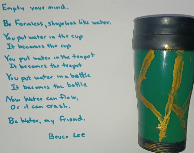 I have also been reading the philosophical writings of Bruce Lee. He was as much of Thinking Man as he was as fighter. His “Be like Water”should be taught in the schools. But I made this reminder for myself.